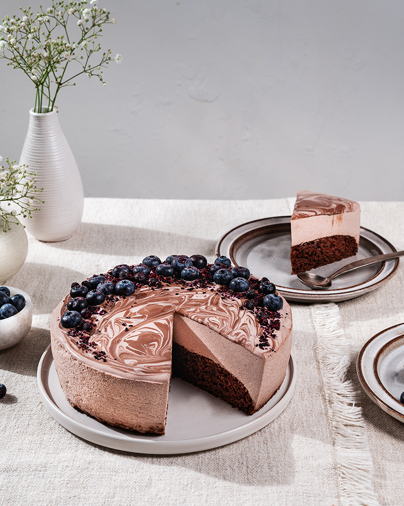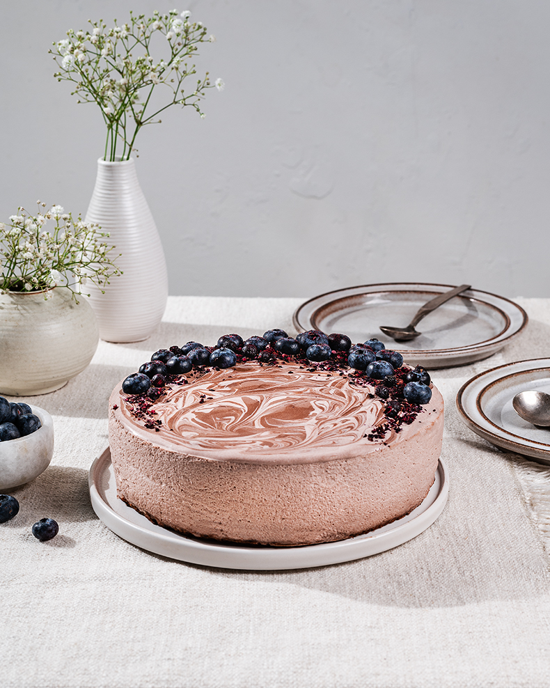 Põhja valmistamiseks sega keefir suhkruga ning lisa kakaopulbri ja soodaga segatud jahu. Kalla segu küpsetuspaberiga vooderdatud 20 cm läbimõõduga lahti käivasse küpsetusvormi ja küpseta ahjus 180-kraadise kuumuse juures 20 minutit või kuni koogipõhja susatud tikk puhtana välja tuleb. Lase vormis täielikult jahtuda. Katte valmistamiseks pane želatiinilehed külma vette 5 minutiks pehmenema. Vahusta 1,5 dl vahukoort suhkruga. Sega hapukoor ning kakao omavahel ja lisa segades vahustatud koor. Kuumuta väiksemas potis järele jäänud 0,5 dl vahukoort , võta tulelt, lisa kuivaks pigistatud želatiinilehed ja sega kuni need on täielikult sulanud. Kalla želatiinisegu hapukooremassi hulka ja sega ühtlaseks. Kalla segu vormi, jahtunud koogipõhjale, ja tõsta neljaks tunniks külmikusse tahenema. Eemalda koogivorm ja küpsetuspaber ning tõsta kook serveerimisalusele. Sega kokku hapukoor, tuhksuhkur ja 1 sl kakaod. Eralda saadud kogusest veerandi jagu ja lisa sellele veel 0,5 sl kakaod, nii et see jääks tunduvalt tumedam. Kata kook pealt heledama kakao-hapukooreseguga, lisa teelusikaga üle koogi täppidena tumedamat osa ja aja lusikasabaga siiru-viirulise mustrina laiali. Kaunista kook mustikate ja purustatud külmkuivatatud mustikatega ja serveeri.